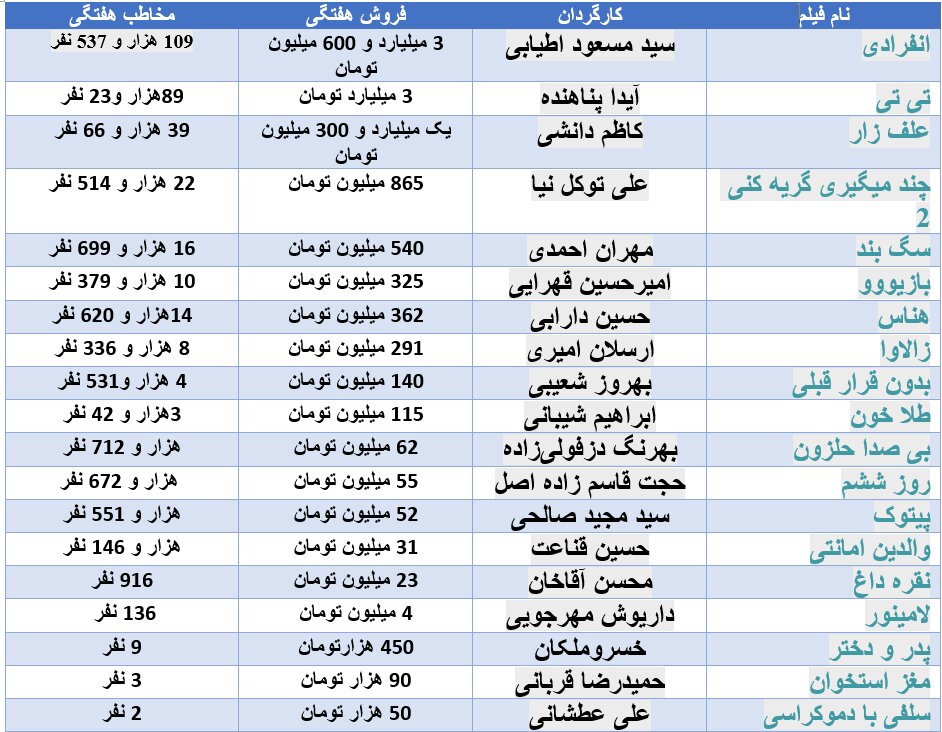 در هفته‌ای که گذشت از میان ۱۹ فیلم، تنها سه فیلم سینمایی «انفرادی»، «تی‌تی» و «علف‌زار» فروش بالای یک میلیارد تومان داشته‌اند.