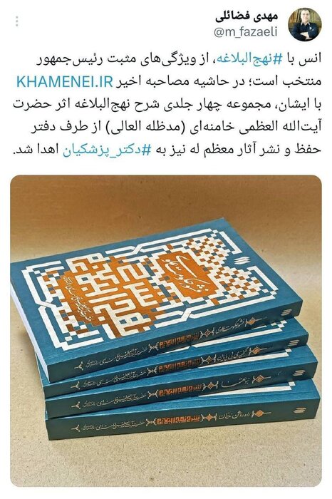 به گزارش راهبرد معاصر؛ مهدی فضائلی در شبکه اجتماعی ایکس نوشت: انس با نهج‌البلاغه از ویژگی‌های مثبت رییس‌ جمهور منتخب است در حاشیه مصاحبه اخیر http://KHAMENEI.IR با ایشان، مجموعه چهار جلدی شرح نهج‌البلاغه اثر حضرت آیت‌الله العظمی خامنه‌ای (مدظله العالی) از طرف دفتر حفظ و نشر آثار معظم له نیز به دکتر پزشکیان اهدا شد.