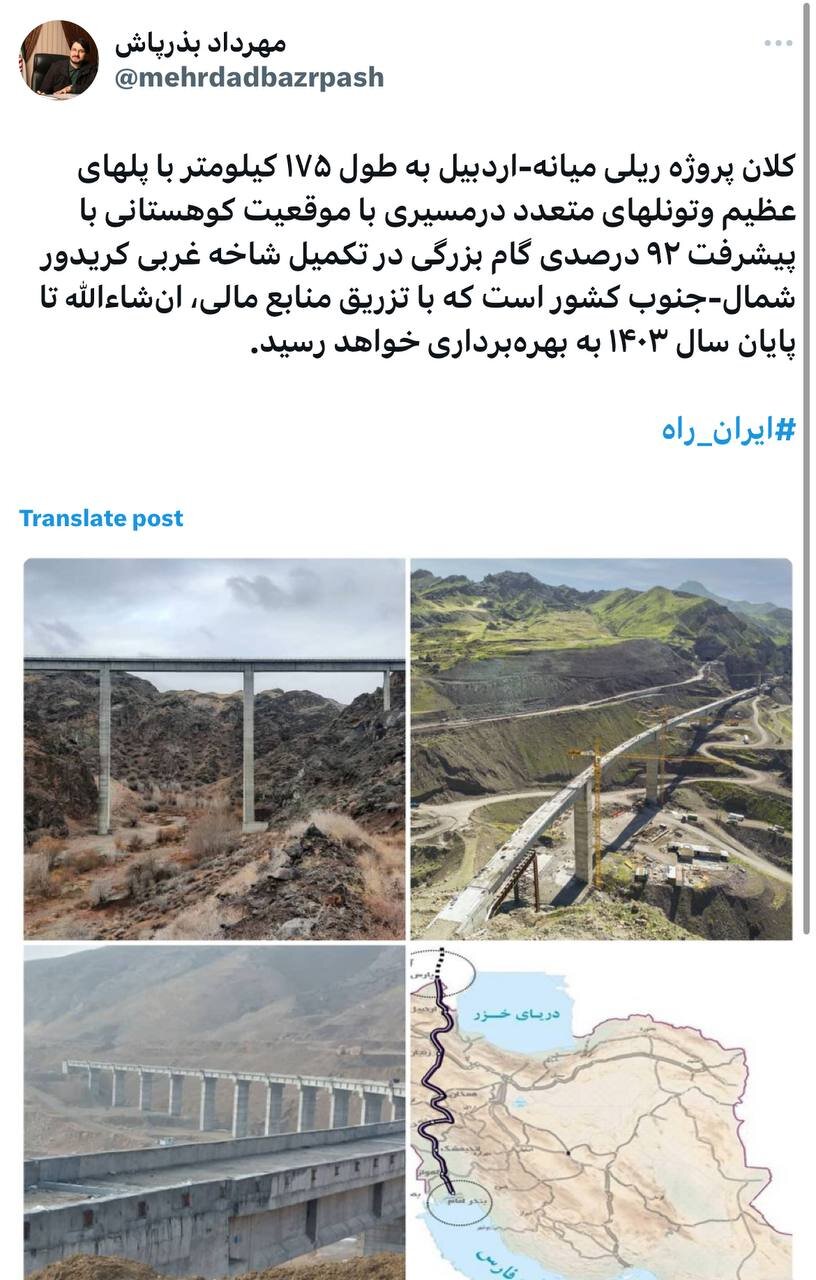 به گزارش راهبرد معاصر؛ مهرداد بذرپاش وزیر راه و شهرسازی با اشاره به تکمیل خط ریلی میانه - اردبیل تا پایان امسال در صفحه شخصی خود نوشت: کلان پروژه ریلی میانه - اردبیل به طول ۱۷۵ کیلومتر با پلهای عظیم تونلهای متعدد در مسیری با موقعیت کوهستانی با پیشرفت ۹۲ درصدی گام بزرگی در تکمیل شاخه غربی کریدور شمال-جنوب کشور است که با تزریق منابع مالی، انشاءالله تا پایان سال ۱۴۰۳ به بهرهبرداری خواهد رسید.