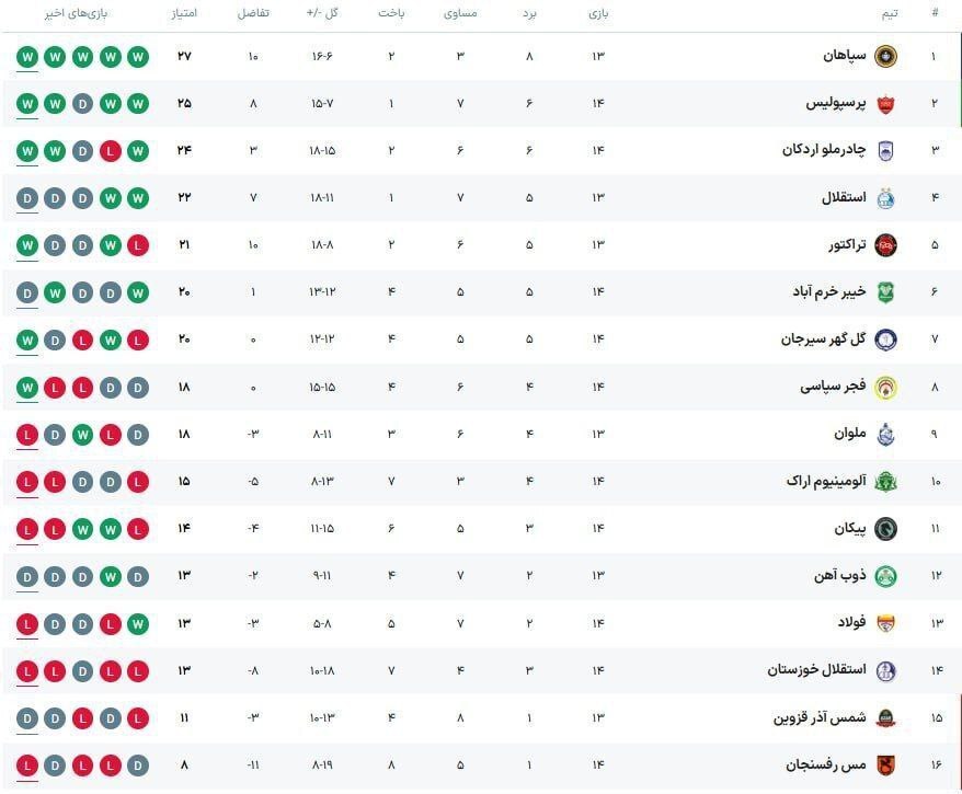به گزارش راهبرد معاصر، جدول لیگبرتر ایران پس از پایان روز دوم از هفته چهاردهم را ببینید. نتایج: فولاد ۰ - ۱ سپاهان ملوان ۰ - ۴ فجر گلگهر ۲ - ۰ مس رفسنجان چادرملو ۳ - ۱ استقلال خوزستان خیبر ۱ - ۱ استقلال