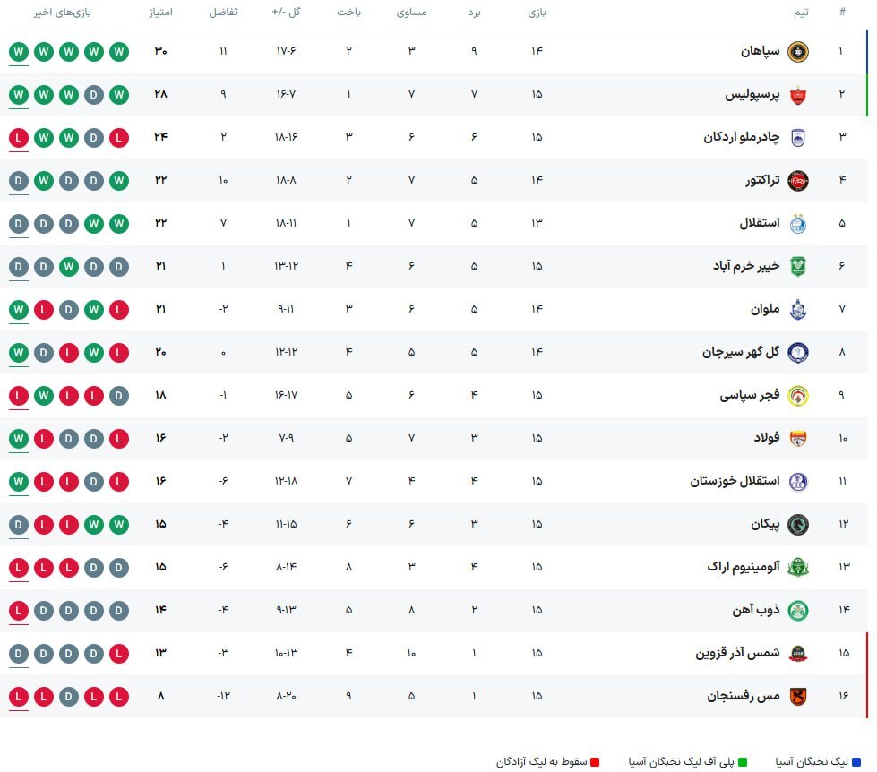 جدول لیگ فوتبال ایران/ سپاهان قهرمان نیم‌فصل لیگ برتر فوتبال شد
