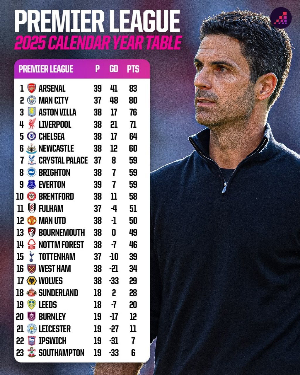 قهرمان فصل قبل در رتبه چهارم! پایان ۲۰۲۵ نحس برای یونایتد و تاتنهام در رتبه ۱۲ و ۱۵.