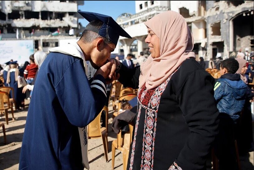 یک دانشجوی فلسطینی در مراسم فارغ‌التحصیلی ۲۳۰ پزشک در حیاط بیمارستان الشفاء در غزه، دست مادرش را می‌بوسد. / خبرگزاری فرانسه