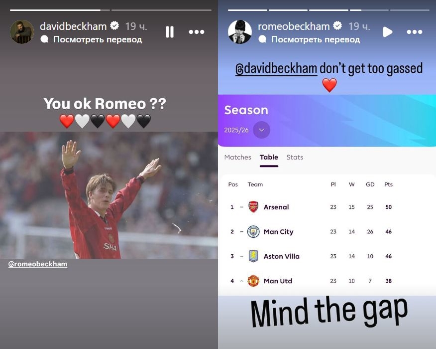 کریخوانی دیوید بکام و پسرش رومئو در اینستاگرام بعد از پیروزی منچستریونایتد مقابل آرسنال مورد توجه قرار گرفته است.